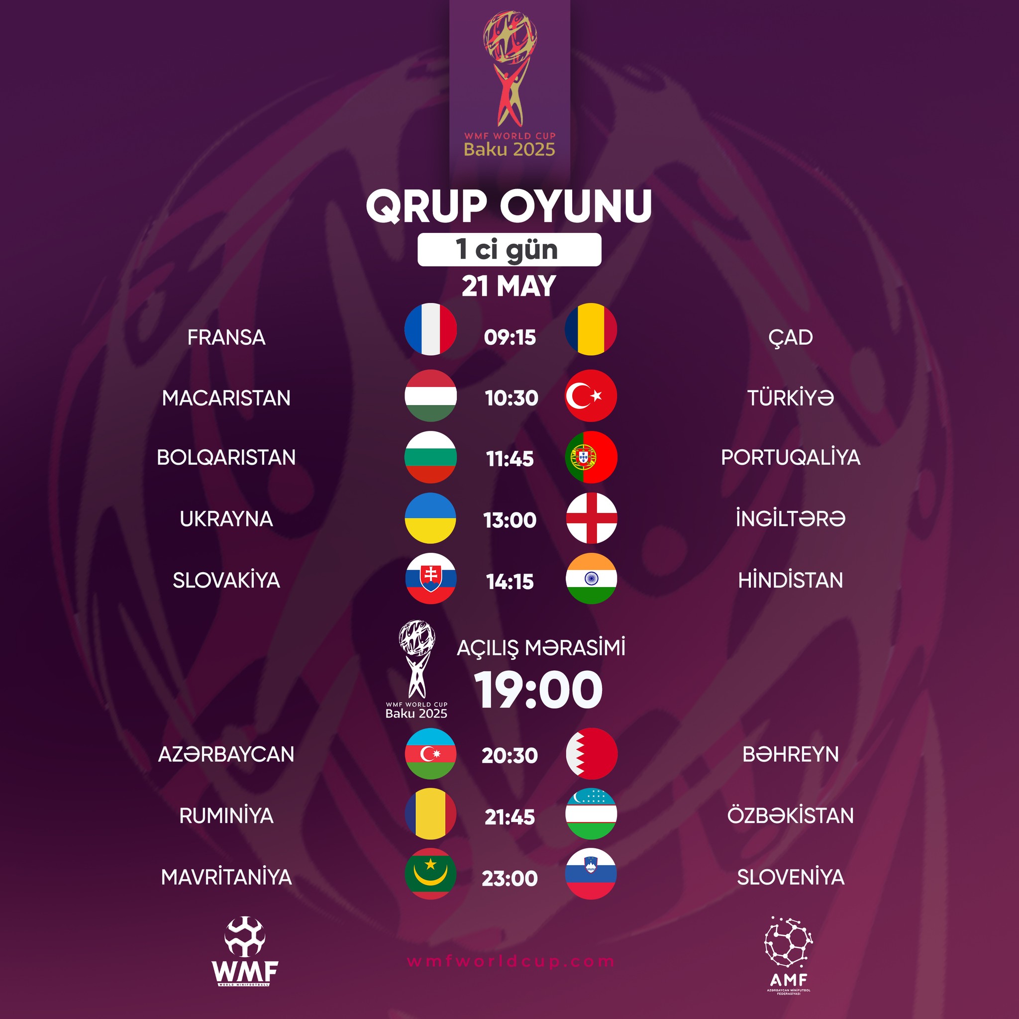Oyunlar isə artıq səhər saat 9:15-də B qrupunun Fransa - Çad qarşılaşması ilə start götürəcək. Ümumilikdə gün ərzində 4 qrupda 8 oyun nəzərdə tutulub.