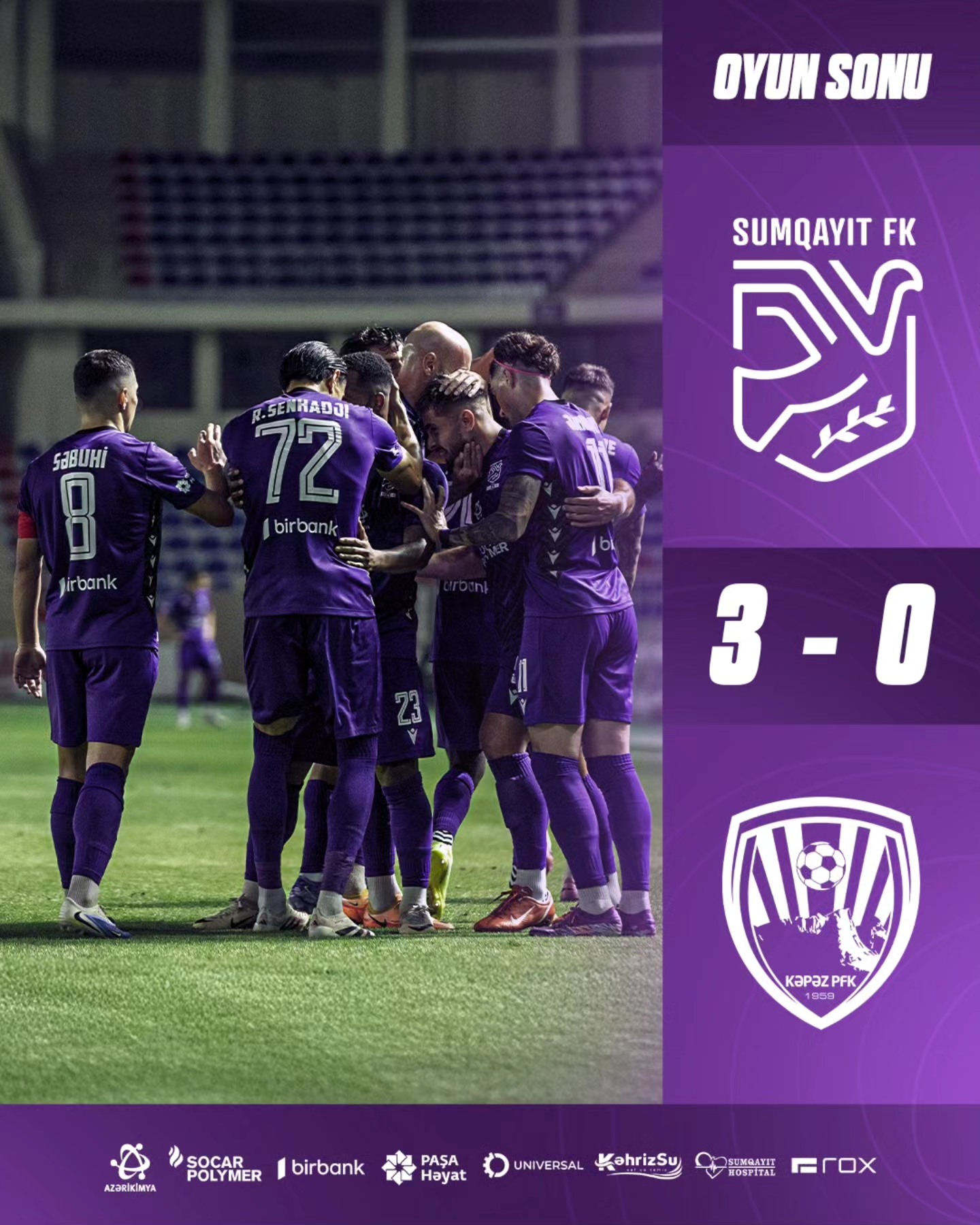 Teleqraf xəbər verir ki, Mehdi Hüseynzadə adına Sumqayıt şəhər stadionunda təşkil olunmuş qarşılaşma meydan sahiblərinin böyük hesablı qələbəsi ilə yekunlaşıb - 3:0.