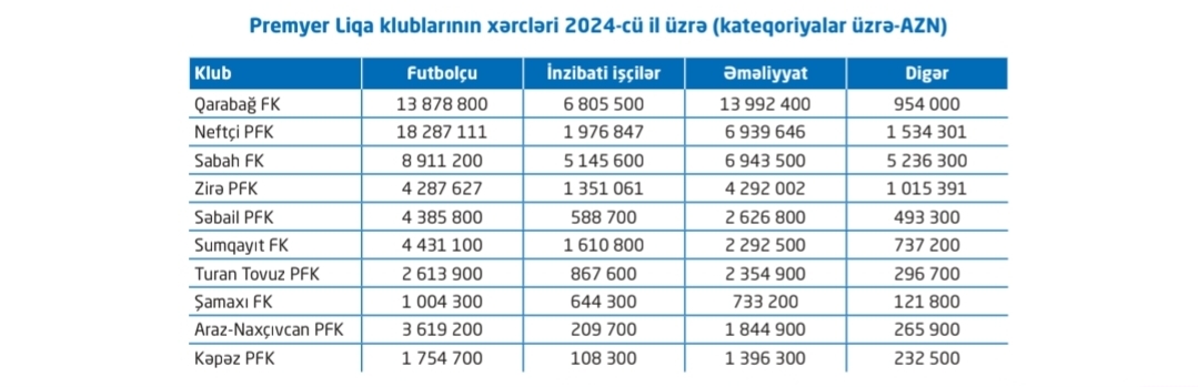 Maraqlıdır ki, "Neftçi" futbolçularına daha çox maş verib. Bakılılar 2024-cü ildə oyunçularına ümumilikdə 18 milyon manatdan çox məvacib verib.