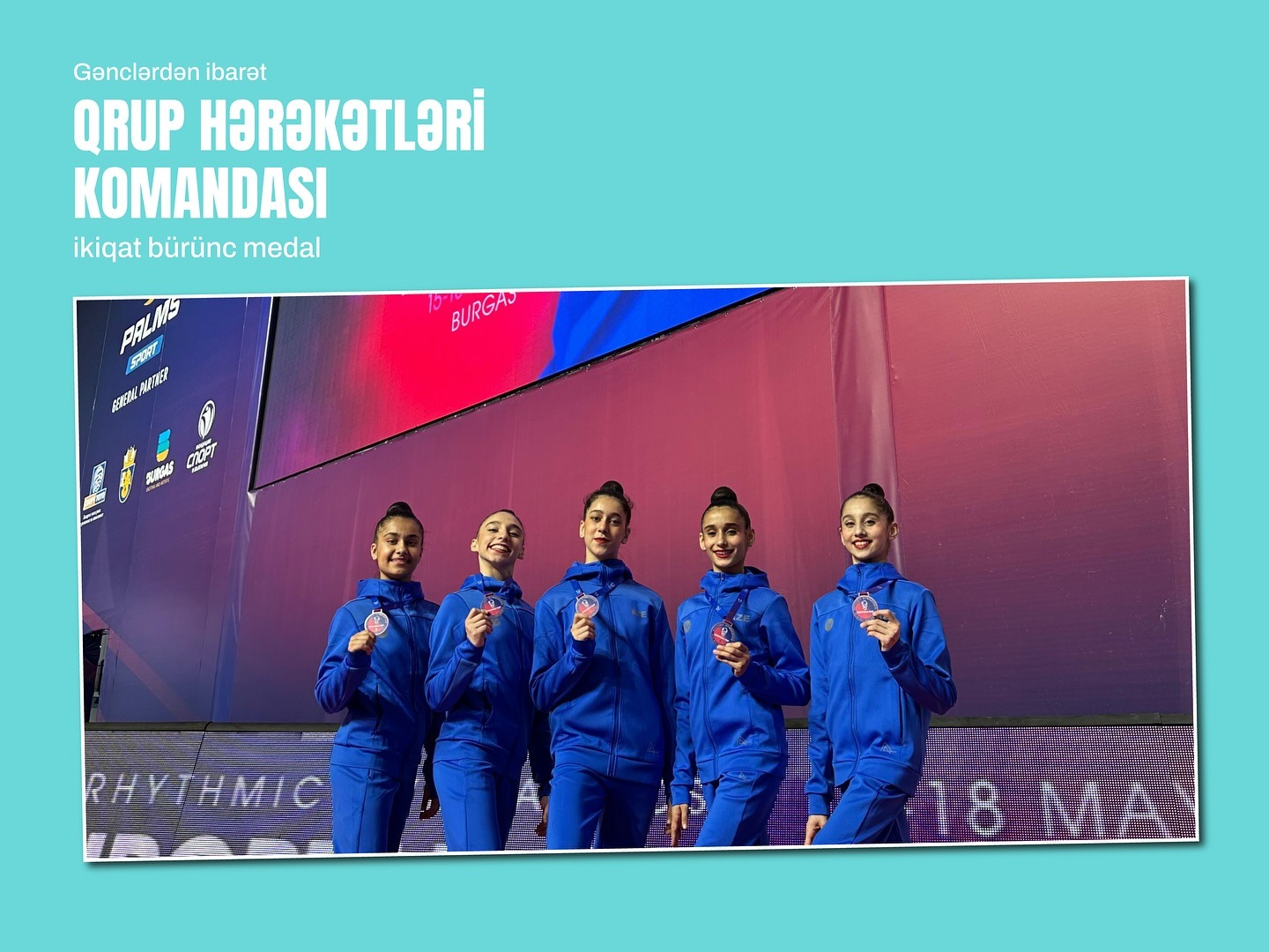 Azərbaycan Gimnastika Federasiyasının mətbuat xidmətindən Teleqraf-a verilən məlumata görə, böyüklərdən ibarət qrup hərəkətləri komandası 3 top + 2 halqa proqramında (25.150 xal) gümüş, gənclərdən ibarət qrup hərəkətləri komandası çoxnövçülük (44.000 xal) və 5 halqa (23.650 xal) proqramında ikiqat bürünc medal əldə edib.