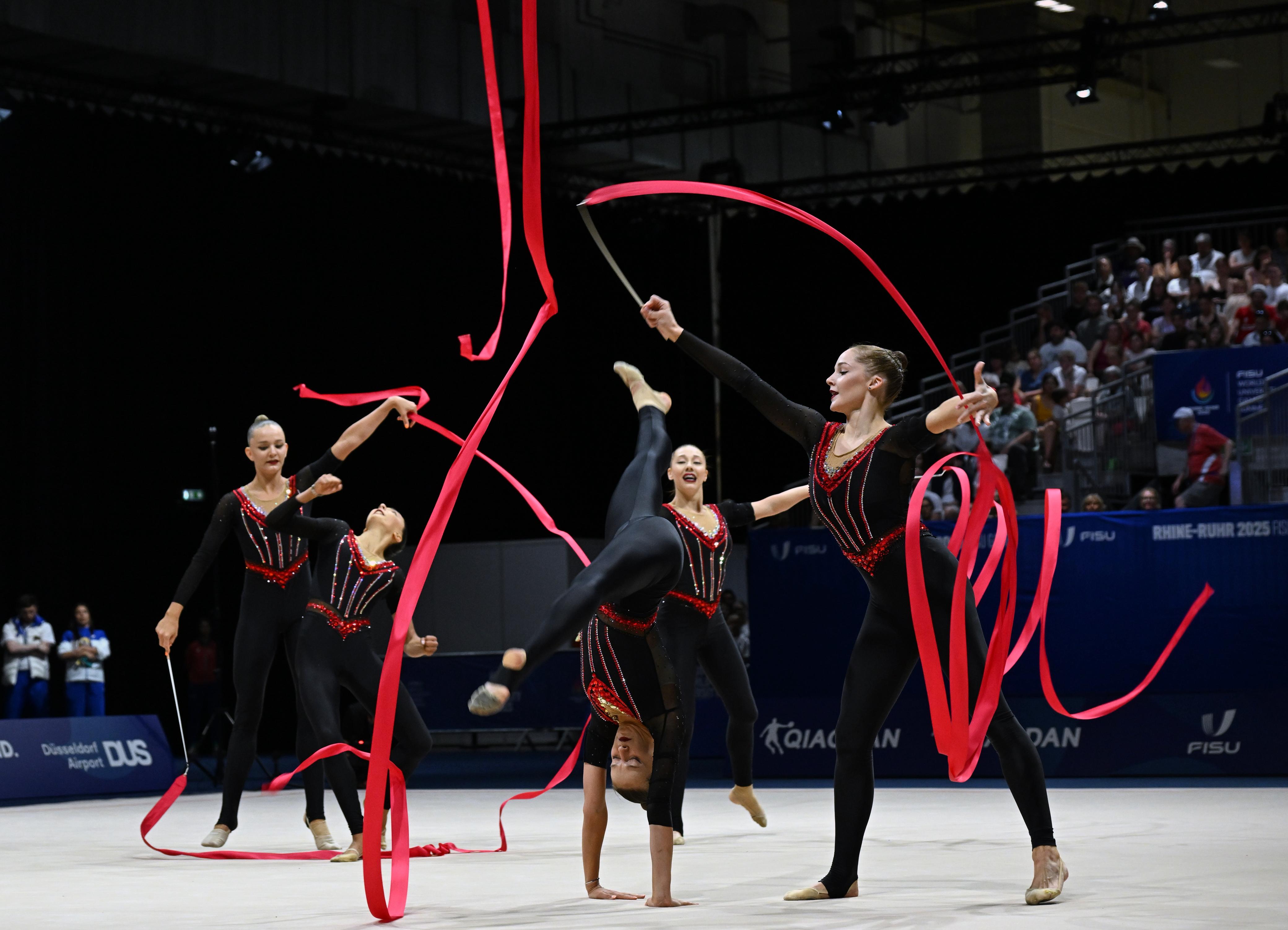 Yelizaveta Luzan, Darya Sorokina, Kamilla Əliyeva, Ləman Əlimuradova və Güllü Ağalarzadə lentlə hərəkətlərdə 22.850 xalla Universiadanın qalibi olublar.