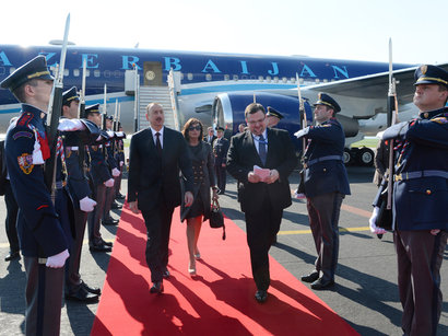 Azərbaycanın və Çexiyanın dövlət bayraqlarının dalğalandığı Praqanın Hökumət Aeroportunda dövlət başçımızın şərəfinə fəxri qarovul dəstəsi düzülüb.