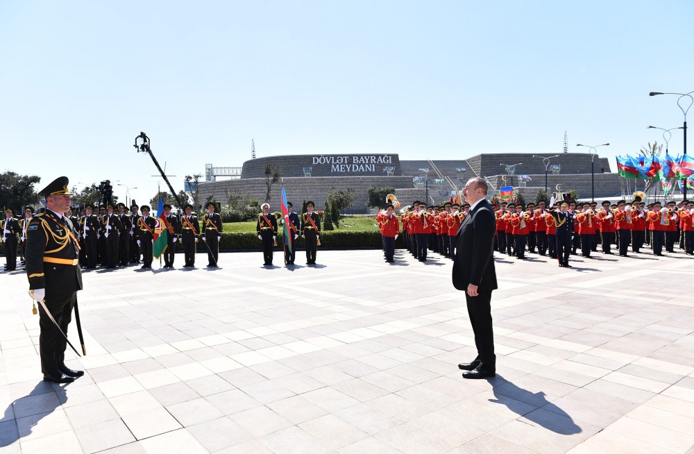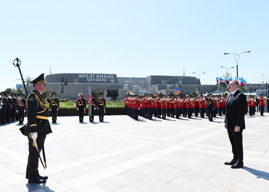 Fəxri qarovul dəstəsi hərbi marşın sədaları altında dövlətimizin başçısının qarşısından keçib.