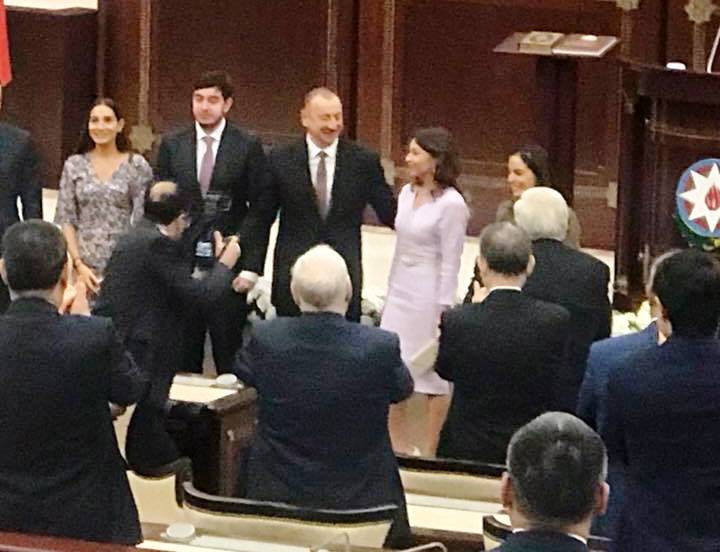 Azərbaycan Respublikasının Prezidenti İlham Əliyev əlini Azərbaycan Respublikası Konstitusiyasının üzərinə qoyaraq and içib: