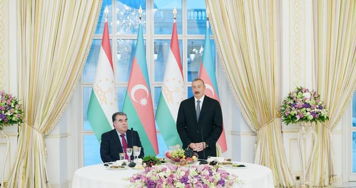 Bir daha bizim bütün əziz qonaqlarımızı Azərbaycanda səmimi qəlbdən salamlayıram. Bu gün ölkələrimiz arasındakı münasibətlərin tarixində əlamətdar gündür. Tacikistan Prezidentinin Azərbaycana rəsmi səfəri münasibətlərimizin inkişafında mühüm mərhələdir. Səfər çox uğurlu keçir. Biz bu gün ikitərəfli münasibətlərin gündəliyində duran bir çox məsələlərlə bağlı ətraflı danışıqlar, fikir mübadiləsi apardıq. Əməkdaşlığın möhkəmlənməsinə, qarşılıqlı fəaliyyətin genişlənməsinə ölkələrimizin sadiq olduğunu bir daha təsdiq etdik və ticari-iqtisadi münasibətlərin möhkəmləndirilməsi üçün mühüm yolları müəyyənləşdirdik. Siz hamınız sənədlərin imzalanması mərasimində iştirak etmisiniz. Təkcə bu sənədlərin siyahısı münasibətlərimizin səviyyəsini xarakterizə edir. Bu gün imzalanan sənədlər xeyli fəaliyyət sahəsini əhatə edir. Əminəm ki, bunların hamısı vaxtında icra ediləcək və bu da bizim münasibətlərimiz üçün daha möhkəm təməl yaradacaq.