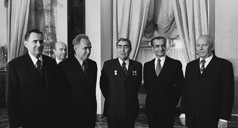 Soldan sağa: SSRİ-nin xarici işlər naziri Andrey Qromıko, Nazirlər Sovetinin sədri Aleksey Kosıgin, Sov.İKP MK-nın baş katibi Leonid Brejnev, Məhəmməd Rza Pəhləvi və SSRİ Ali Soveti Rəyasət Heyətinin sədri Nikolay Podqornı