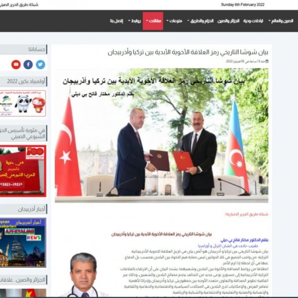 Əlcəzairin “Əl Hərir” portalında Türkiyə və Avrasiya üzrə tədqiqatçı, suriyalı həkim Muxtar Fatih Beydilinin “Şuşa Bəyannaməsi Türkiyə-Azərbaycan qardaşlığının rəmzidir” sərlövhəli məqaləsi yerləşdirilib.