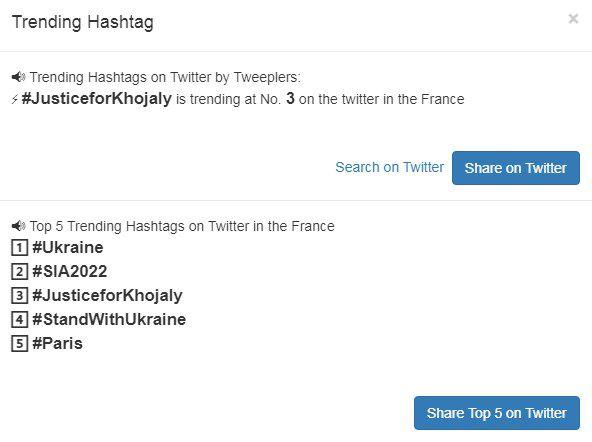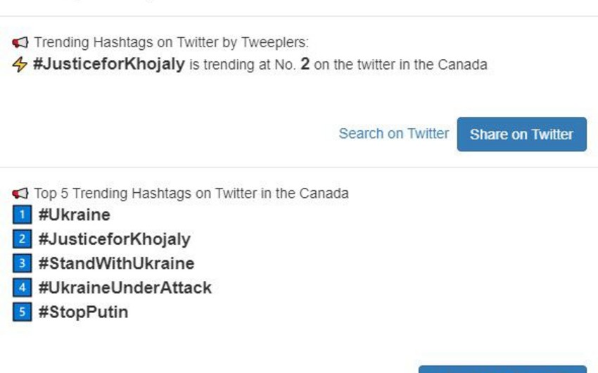 Amerika trendində #JusticeforKhojaly 4-cü yer, Fransa trendində 3-cü yer, Kanada trendində isə 2-ci yerdə olub.
