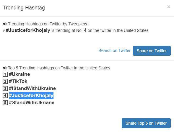 Teleqraf.com xəbər verir ki, kampaniya çərçivəsində #JusticeforKhojaly həştəqi dünya trendində 1-ci yer, #HocalıKatliamı isə 5-ci yerdə olub.