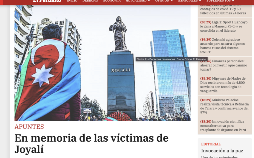 Perunun rəsmi dövlət qəzeti və ən nüfuzlu mətbu orqanı olan “El Peruano”da bu ölkədəki səfirimiz Məmməd Talıbovun Xocalı soyqırımının 30-cu ildönümü ilə bağlı məqaləsi dərc olunub.