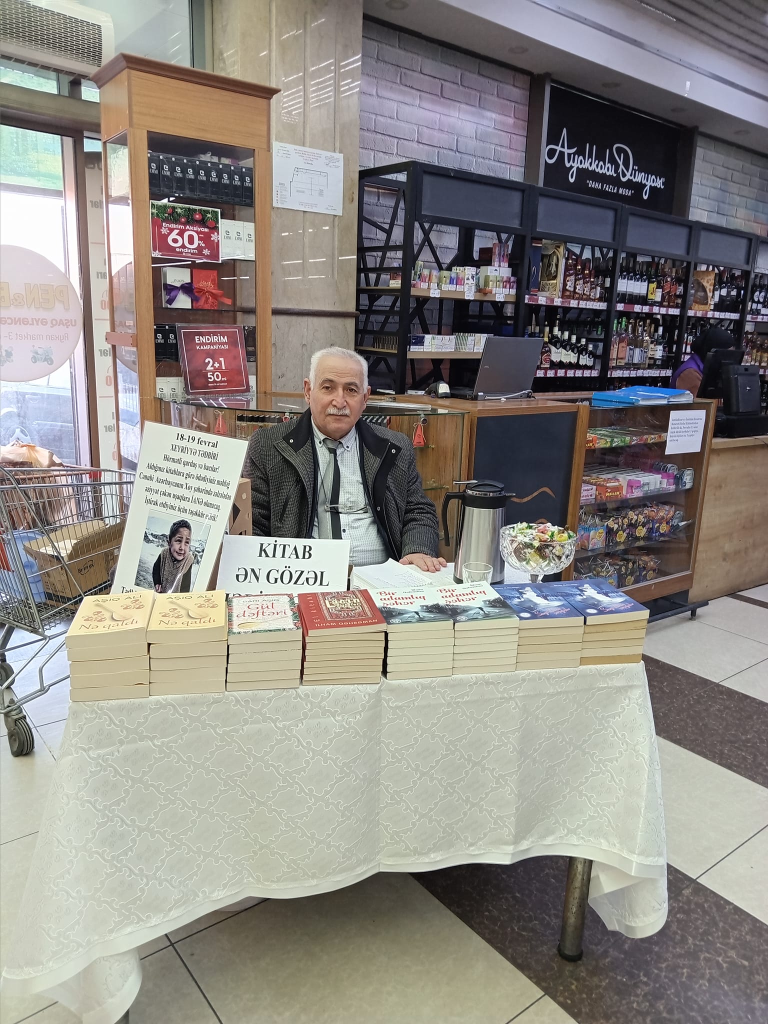 Bakıda Zabrat qəsəbəsində məşhur bir marketin administratoru ilə danışıb fevralın 18-19-da məlum məqsədlə aksiya keçirmək istədiyimi dedim. Sağ olsunlar, həmin market rəhbərliyi dəstək verdi, girişdə mənə yer ayırdılar. Xüsusi bir banner hazırlatdım, kitabı alıcılarına və ianə edənlərə ağız şirinliyi üçün konfet də aldım.