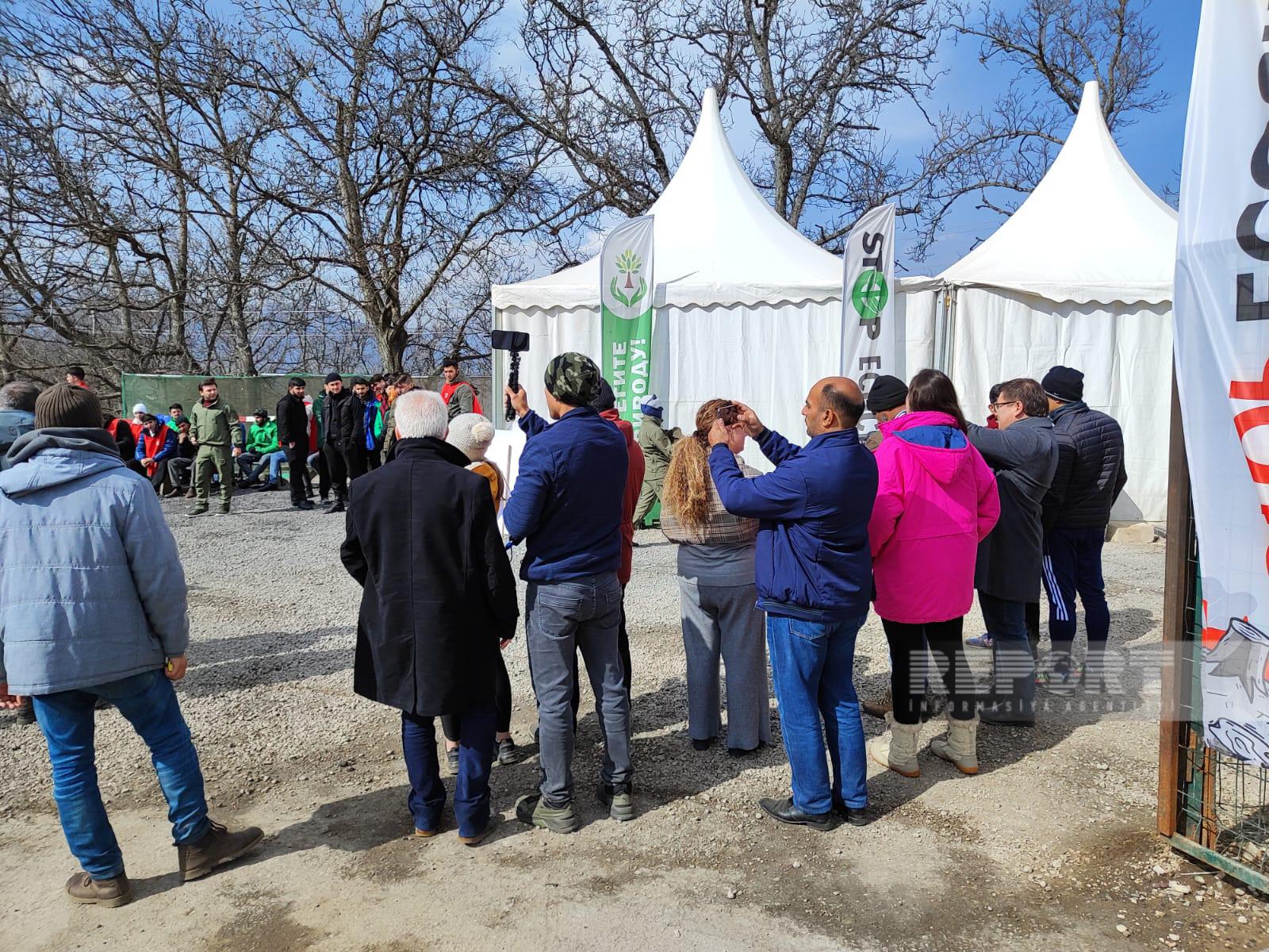 Xarici KİV nümayəndələri toplanış yerindən çəklişlər edirlər, etirazçılar ekologiyanı qorumağa çağıran şüarlar səsləndirirlər.