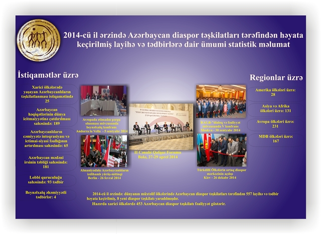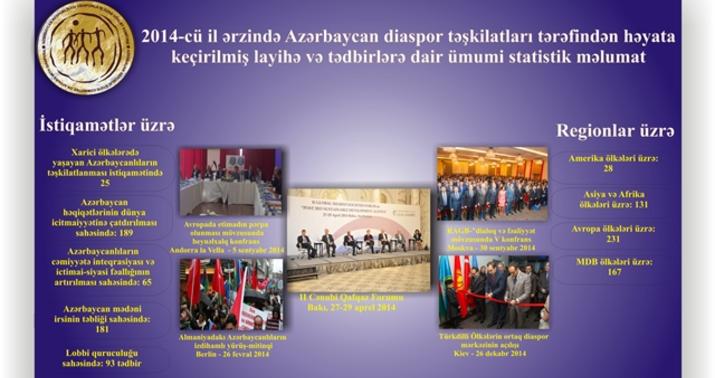Teleqraf.com-a daxil olan hesabatda bildirilir ki, 2014-cü il ərzində xarici ölkələrdə fəaliyyət göstərən Azərbaycan diaspor təşkilatları tərəfindən 557 tədbir və layihə həyata keçirilib. Qeyd olunur ki, bu tədbirlər əsasən xaricdəki azərbaycanlıların təşkilatlanması, yaşadıqları ölkələrin ictimai-siyasi həyatında iştirak səviyyəsinin artırılması, Azərbaycan həqiqətləri ilə bağlı dünya ictimaiyyətinin məlumatlandırılması, habelə diaspor təşkilatları arasında Azərbaycan naminə əməkdaşlığın daha da gücləndirilməsi və inkişafı, lobbi quruculuğu kimi istiqamətləri əhatə edib.