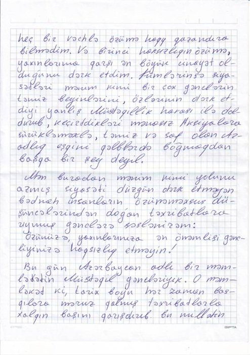 Özüm də bilmədən qeyri-ixtiyari düşdüyüm vəziyyətin səbəbini düşündükcə, heç bir vəchlə özümə haqq qazandıra bilmədim. Və birinci haqsızlığın özümə, yaxınlarıma qarşı ən böyük cinayət olduğunu dərk etdim. Kimlərinsə siyasətləri mənim kimi bir çox gənclərin təmiz beyinlərini özlərinin dərk etdiyi yanlış müstəqillik havası ilə doldurub, keçirdikləri mənasız Aksiyalara sürükləməklə, təmiz və saf olan azadlıq eşqini qəlblərdə boğmaqdan başqa bir şey deyil.