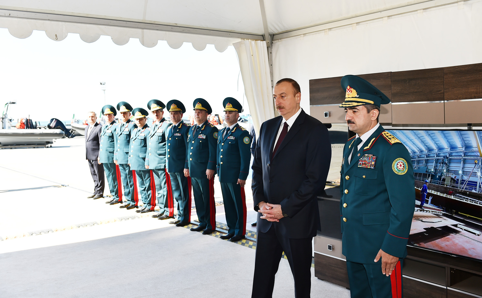 Bu gün Azərbaycan Prezidenti, Silahlı Qüvvələrin Ali Baş Komandanı İlham Əliyev Dövlət Sərhəd Xidməti Sahil Mühafizəsinin Gəmi İnşası və Təmiri Mərkəzində tikintisi başa çatdırılan ikinci dərəcəli sərhəd gözətçi gəmisi və yeni istifadəyə verilən müasir itisürətli qayıqlarla tanış olub.