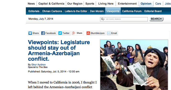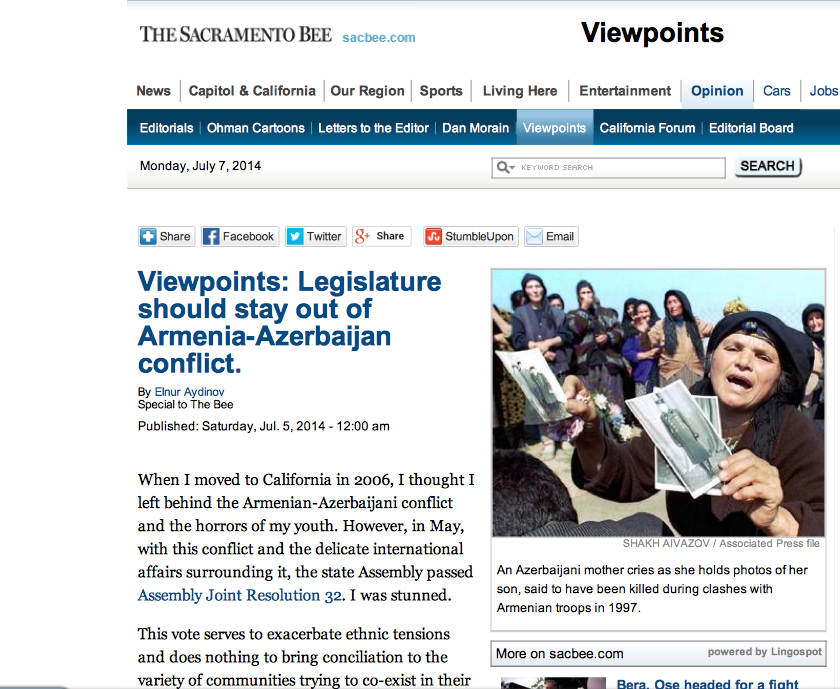 Kaliforniyanın nüfuzlu “Sacramento Bee” qəzetində Kaliforniyanın azərbaycanlı icmasının fəallarından olan Elnur Aydınovun Ermənistanın işğalçılıq siyasətindən bəhs edən məqaləsi dərc olunub.