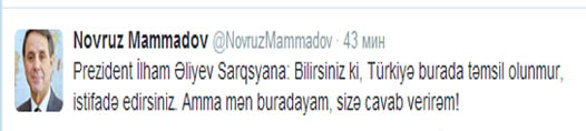 Teleqraf.com-un məlumatına görə, Prezident Administrasiyasının (PA) Xarici əlaqələr şöbəsinin müdiri Novruz Məmmədov Twitter hesabında İ.Əliyevin S.Sarkisyana cavabını yazıb: