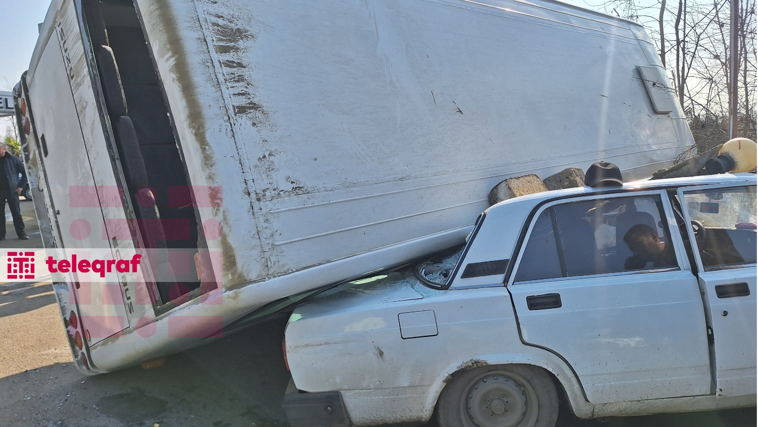 Lənkəranda sərnişin avtobusu minik avtomobilinin üzərinə aşıb.