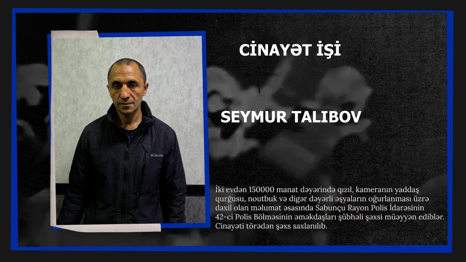 Daxili İşlər Nazirliyinin Mətbuat xidmətindən Teleqraf-a verilən məlumata görə, iki evdən 150 min manat dəyərində qızıl, kameranın yaddaş qurğusu, noutbuk və digər dəyərli əşyaların oğurlanması üzrə daxil olan məlumat əsasında Sabunçu Rayon Polis İdarəsinin 42-ci Polis Bölməsinin əməkdaşları şübhəli şəxsi müəyyən ediblər.