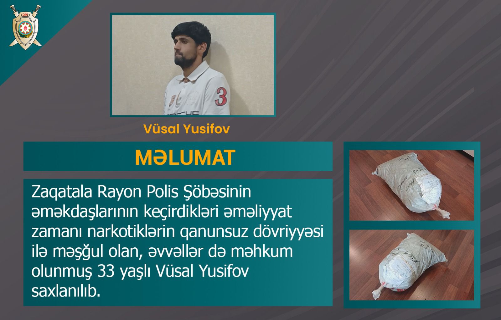Zaqatala Rayon Polis Şöbəsinin əməkdaşlarının keçirdikləri əməliyyat zamanı narkotiklərin qanunsuz qanunsuz dövriyyəsi ilə məşğul olan, əvvəllər də məhkum olunmuş 33 yaşlı Vüsal Yusifov saxlanılıb.