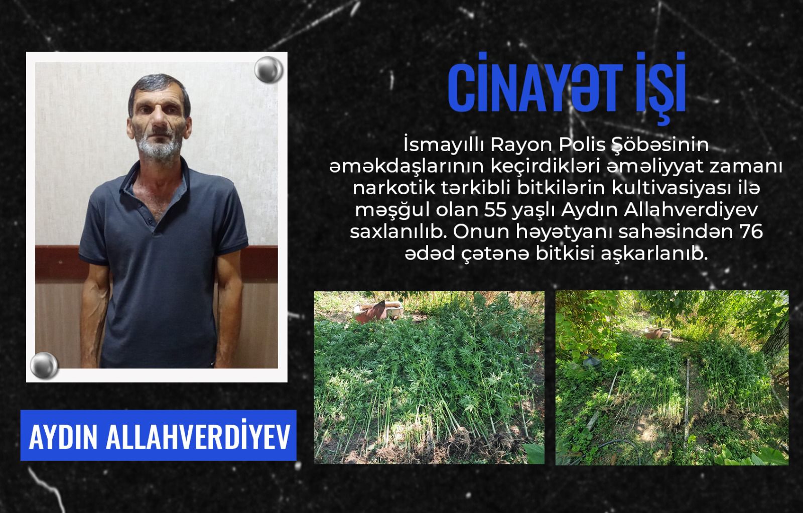 Onun həyətyanı sahəsindən bostan bitkilərinin arasında əkdiyi 76 ədəd çətənə bitkisi aşkarlanıb. Saxlanılan şəxs narkotik tərkibli bitkiləri satmaq məqsədilə yetişdirdiyini bildirib.