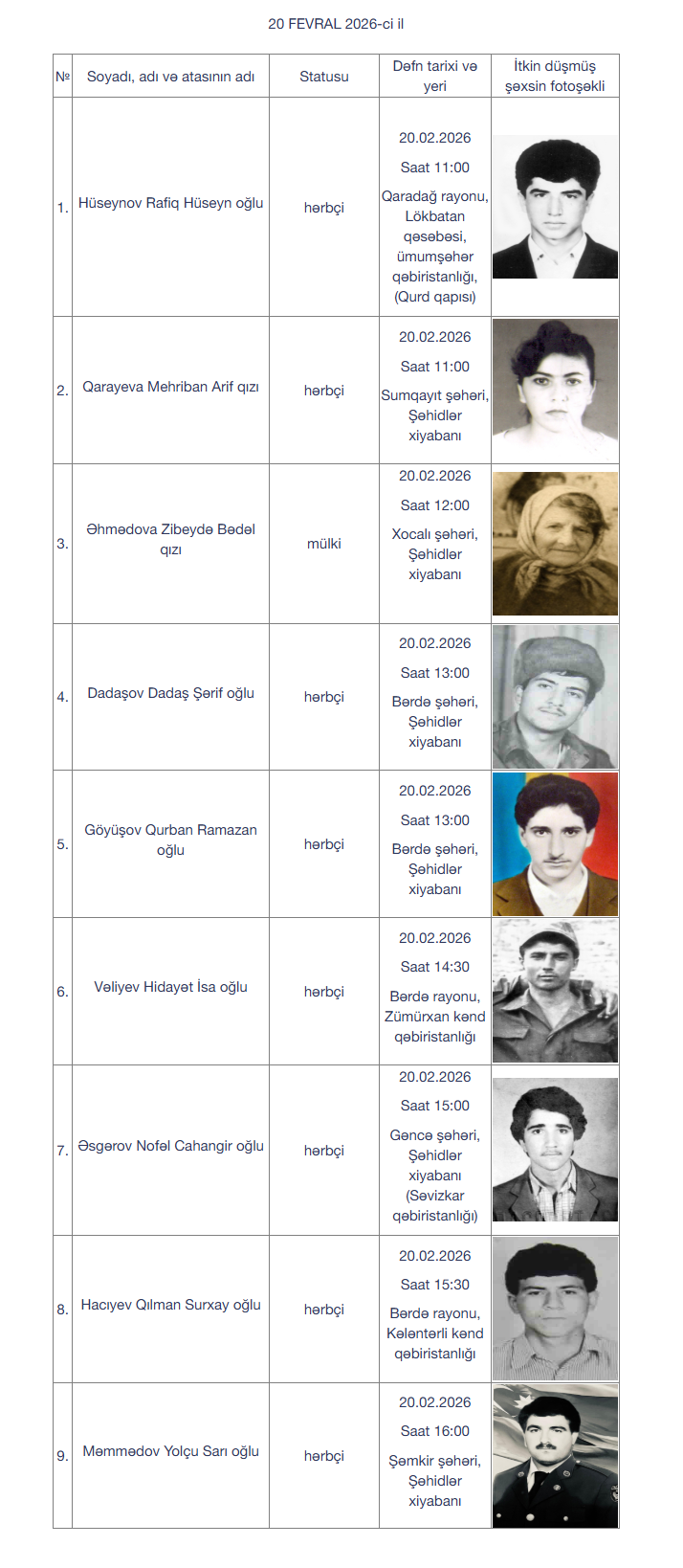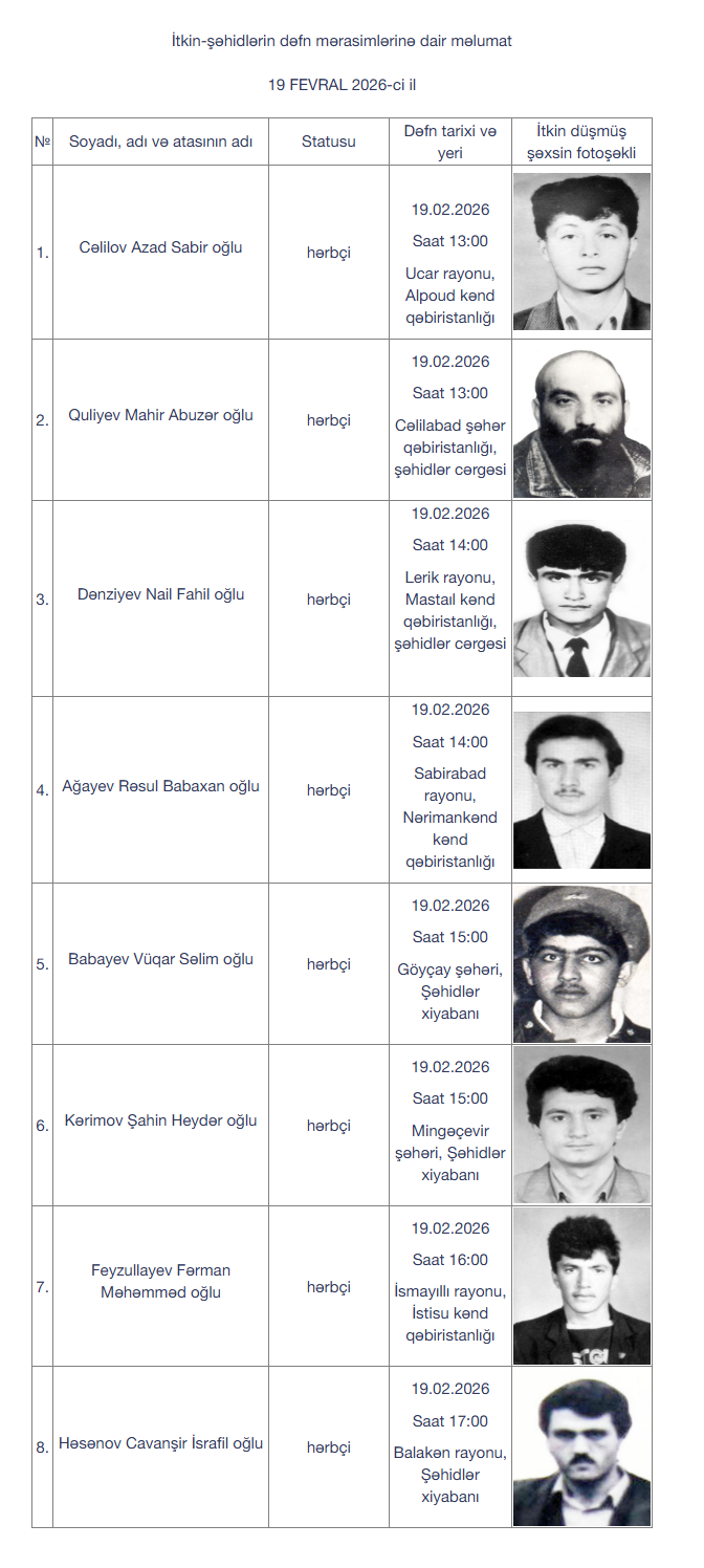 İtkin-şəhidlərin bir qismi fevralın 19-da, digər qismi isə fevralın 20-də dəfn olunacaq.