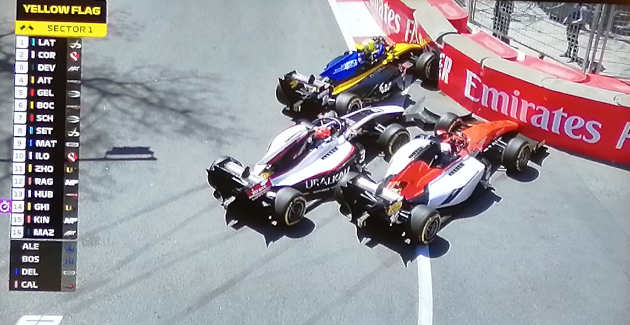 Teleqraf.com xəbər verir ki, yarış zamanı üç bolid toqquşub. Belə ki, “BWT Arden” komandasının xanım pilotu Tatyana Kalderon, “Trident” komandasının pilotu Ralf Boşunq və “Carlin” komandasının pilotu Luis Deletrazın idarə etdiyi bolidlər toqquşub.