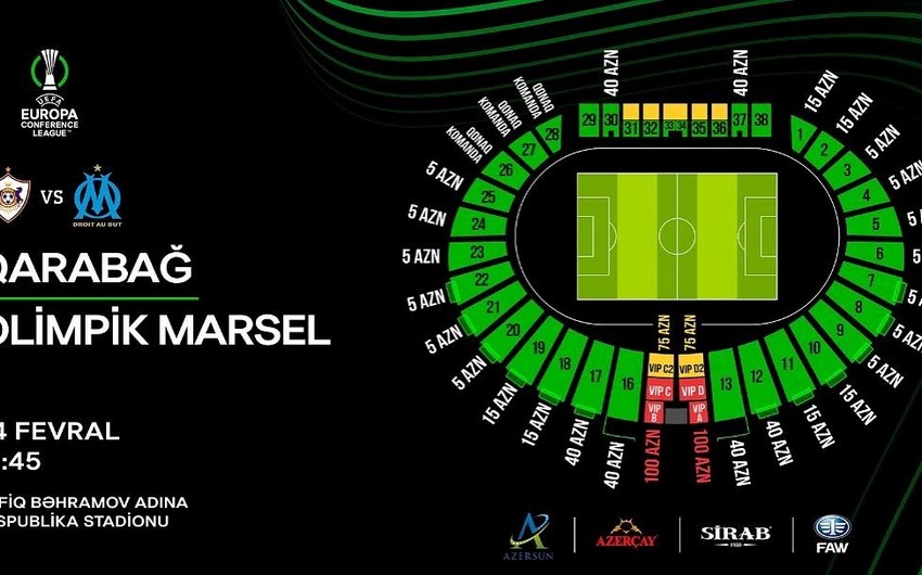 UEFA Konfrans Liqasının pley-off mərhələsində “Qarabağ” və Fransa “Marsel”i arasında keçiriləcək cavab oyununun biletləri fevralın 13-də saatışa çıxarılacaq.