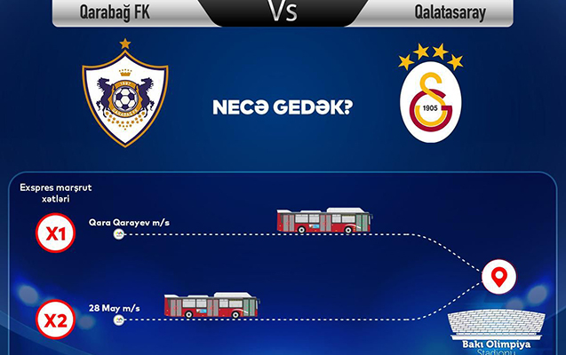 "Qarabağ" və "Qalatasaray" futbol komandaları arasında keçiriləcək yoldaşlıq oyunu ilə əlaqədar azarkeşlərin daşınmasının həyata keçirilməsi məqsədilə 26.03.2023-cü il tarixində “Qara Qarayev” metro stansiyası və Səməd Vurğun bağı (Dilarə Əliyeva küçəsi) Bakı Olimpiya Stadionu ilə əlaqələndirən X1 və X2 nömrəli ekspres marşrutlar təşkil edilib.
