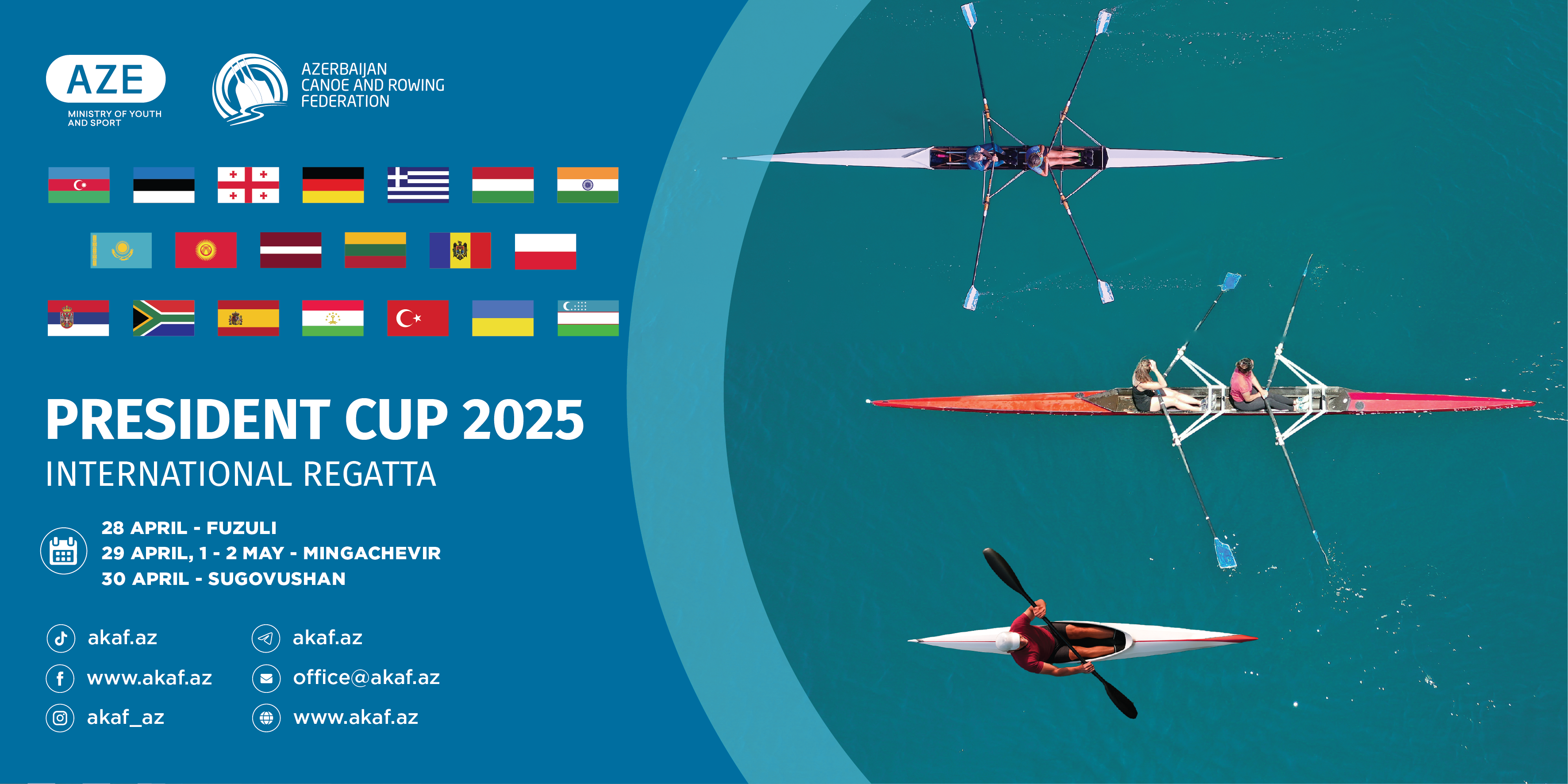 Reqatanın rəsmi paradı və komandaların təqdimatı aprelin 29-da Mingəçevir şəhəri Heydər Əliyev prospektində keçiriləcək. 30 aprel tarixində Qarabağın daha bir dilbər guşəsi olan Suqovuşanda “Prezident Kuboku-2025” beynəlxalq reqatasının rəsmi açılış mərasimi və 200 metr məsafədə yarışlar baş tutacaq. Reqata 1-2 may tarixlərində Mingəçevir “Kür” Olimpiya Tədris-İdman Mərkəzində davam edəcək. Burada komandalar avarçəkmənin kayak, kanoe və akademik növündə müxtəlif məsafələrdə mübarizə aparacaqlar.