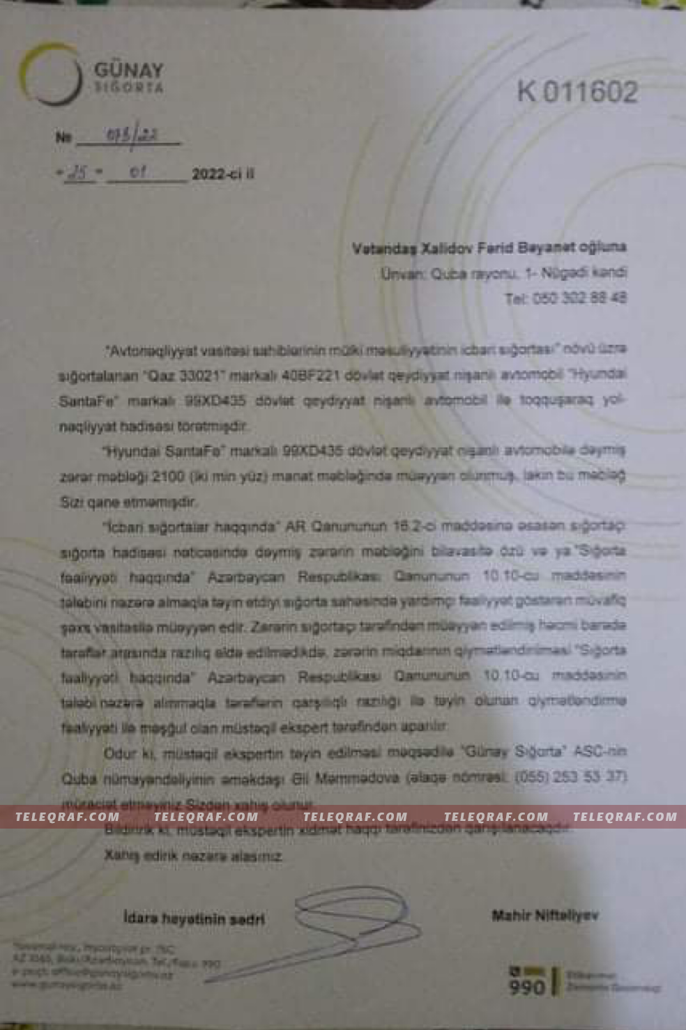 Onu da qeyd edim ki, “Hundai” servisdə bu rəsmi aktın qiyməti 150 manatdır. Əgər avtomobil həmin servisdə təmir olunarsa, bu zaman 150 manat çıxılmır. Əgər təmir müddətində əlavə xərclər çıxarsa, o da 4850 manata əlavə olaraq hesablanacaq. Servisdən aldığımız aktı aparıb “Günay Sığorta”ya və onun yönləndirdiyi servis mərkəzinə təqdim etdik, amma onlar bu rəsmi akta məhəl qoymadılar. Bir sözlə, süründürməçiliyə başladılar”.