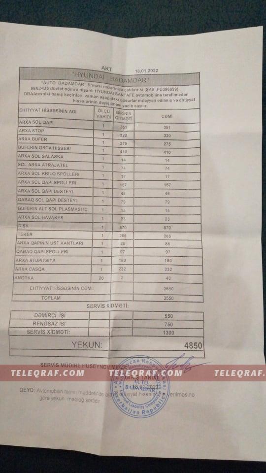Təxmini avtomobilə baxıb 5000 manata yaxın zərərin dəydiyini dedim. Servis dedi ki, bunu sübut edə bilərsinizmi? Avtomobilə dəyən zərərin dəqiq həcminin hesablanması üçün “Hundai” servisə apardım. Qiymətləndirmə zamanı servis avtomobilimə dəyən zərərin məbləğinin 4850 manat olduğunu aktlaşdırdı.