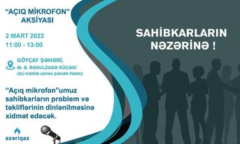 “Səyyar qəbul otağı” martın 2-də saat 11:00-dan 13:00-a qədər sahibkarların xidmətində olacaq. İstənilən təklif və problemlər yerindəcə aydınlaşdırılacaq və müvafiq qərarlar veriləcək.