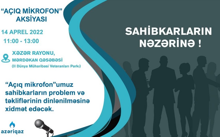 Teleqraf.com “Azəriqaz”a istinadən xəbər verir ki, "Azəriqaz" İB-nin rəhbər şəxsləri Xəzər rayonu, Mərdəkan qəsəbəsi, II Dünya Müharibəsi Veteranları Parkında baş tutacaq aksiyada sahibkarları maraqlandıran sualları cavablandıracaqlar.
