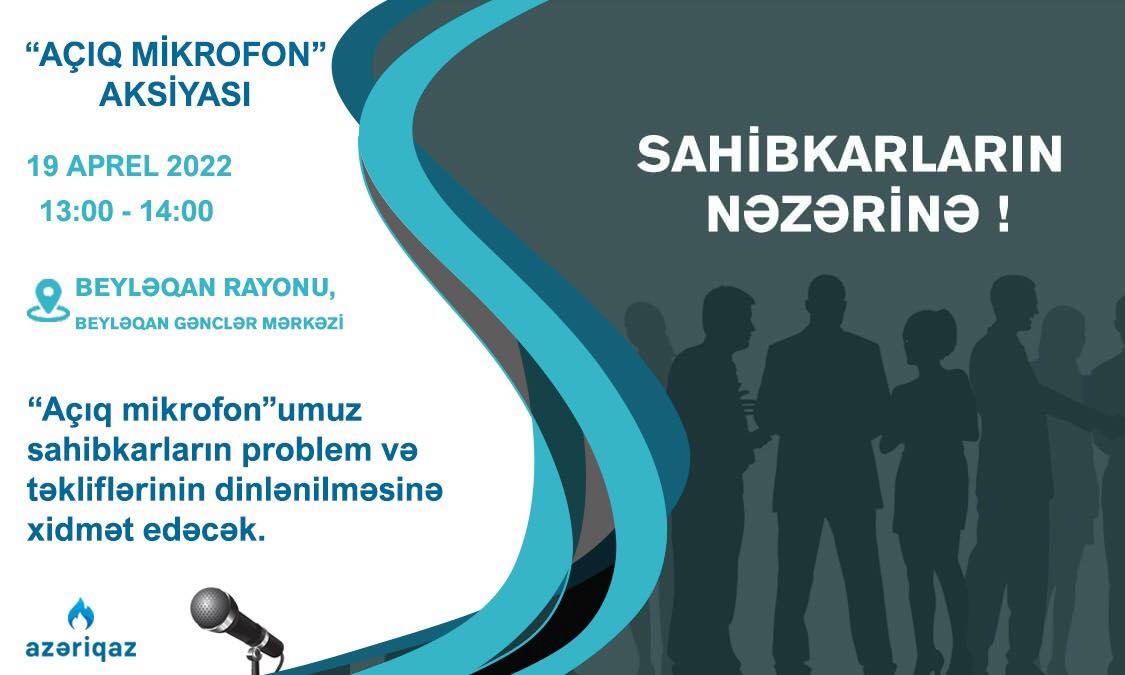 “Azəriqaz” İstehsalat Birliyi rəhbərliyinin “Açıq mikrofon” aksiyası çərçivəsində sahibkarlarla növbəti görüşü Beyləqan rayonunda təşkil olunacaq.