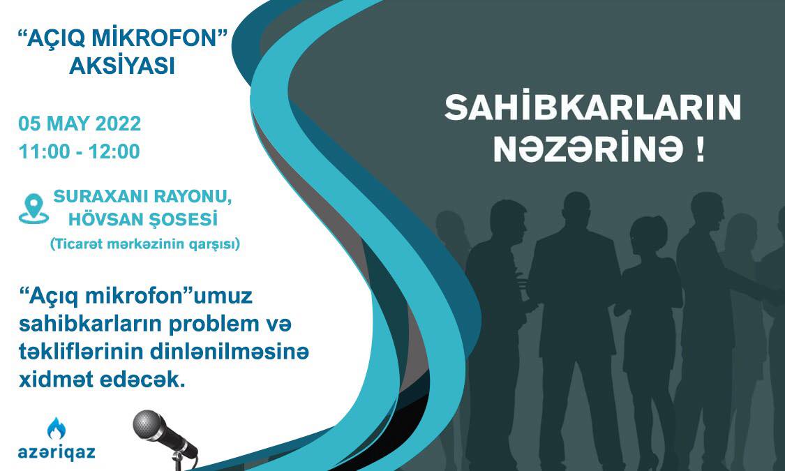 “Azəriqaz” İstehsalat Birliyinin rəhbər şəxslərinin “Açıq mikrofon” aksiyası çərçivəsində sahibkarlarla növbəti görüşü Suraxanı rayonunda təşkil olunacaq.