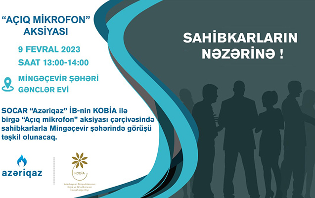 SOCAR “Azəriqaz” İB-nin KOBİA ilə birgə “Açıq mikrofon” aksiyası çərçivəsində sahibkarlarla Mingəçevir şəhərində görüşü təşkil olunacaq.