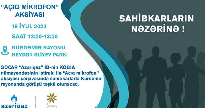 SOCAR “Azəriqaz” İB-nin KOBİA nümayəndəsinin iştirakı ilə “Açıq mikrofon” aksiyası çərçivəsində sahibkarlarla Kürdəmir rayonunda görüşü təşkil olunacaq.