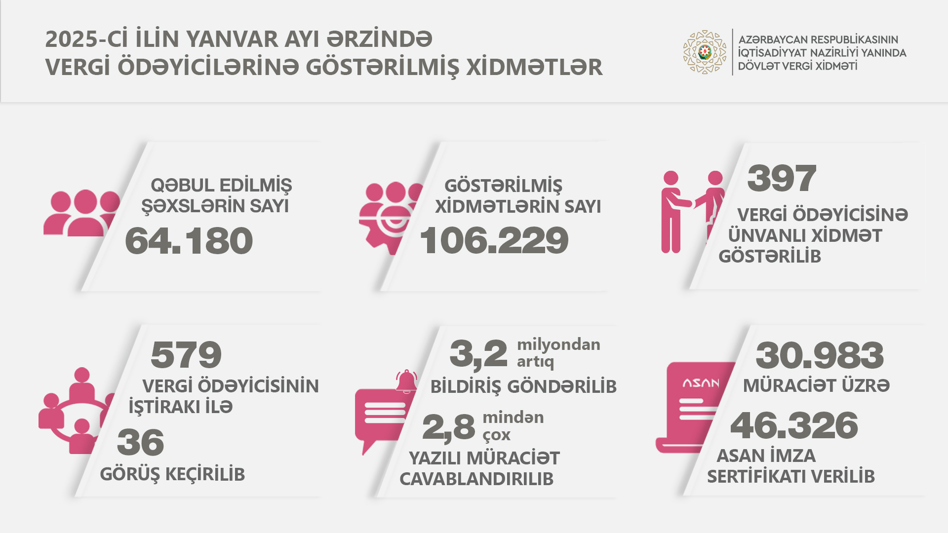 2025-ci ilin yanvar ayı ərzində vergi ödəyicilərindən daxil olmuş 2,8 mindən çox yazılı müraciət cavablandırılıb, onlara 3,2 milyondan artıq məlumatlandırma xarakterli müxtəlif növ bildiriş (məktub) göndərilib. Dövr ərzində 579 vergi ödəyicisinin iştirakı ilə 36 görüş keçirilib, 397 vergi ödəyicisinə ünvanlı xidmət göstərilib.
