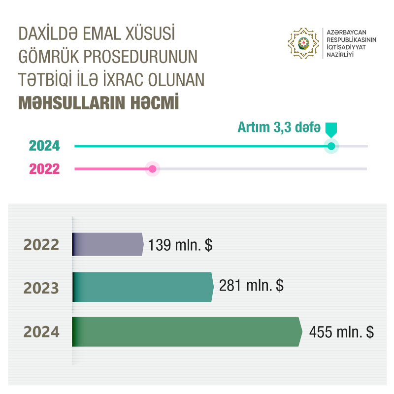 O bildirib ki, bu sahədə müvafiq qaydaların təkmilləşdirilməsi və sadələşdirilməsi nəticəsində ötən il 2022-ci illə müqayisədə prosedurdan yararlanmaqla ixrac olunan malların həcmi 3,3 dəfə artaraq 455 milyon ABŞ dolları təşkil edib.