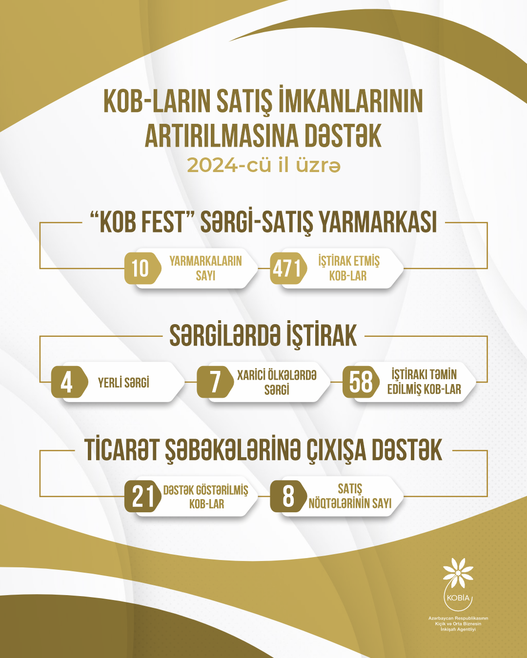 Teleqraf xəbər verir ki, 60-a yaxın KOB subyektinin Azərbaycanda və xarici ölkələrdə keçirilən 11 sərgidə (4-ü yerli və 7-si xarici ölkələrdə olmaqla) ödənişsiz olaraq iştirakı təmin edilib. Mikro və kiçik sahibkarların istehsal etdiyi məhsul və xidmətlərin tanıdılması və satışına dəstək məqsədilə 10 “KOB Fest” sərgi-satış yarmarkası keçirilib. Bakı, Göygöl, Şəki, Gəncə, Masallı, Naxçıvan, Zaqatala, Xaçmaz, Göyçay və Zəngilanda təşkil edilmiş yarmarkalarda 471 sahibkar məhsul və xidmətlərini təqdim edib və satışını həyata keçirib.