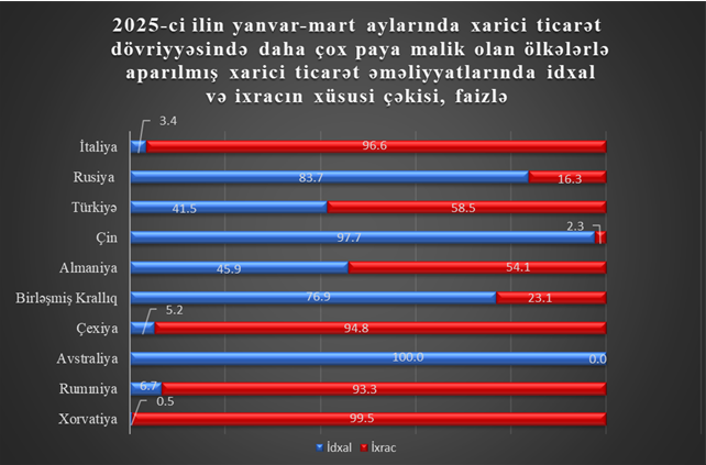 2025-ci ilin yanvar-mart aylarında Azərbaycan Respublikasının hüquqi və fiziki şəxsləri dünyanın 151 ölkəsindəki tərəfdaşları ilə ticarət əməliyyatları həyata keçirmiş, 96 ölkəyə məhsul ixrac olunub, 142 ölkədən idxal olunub.