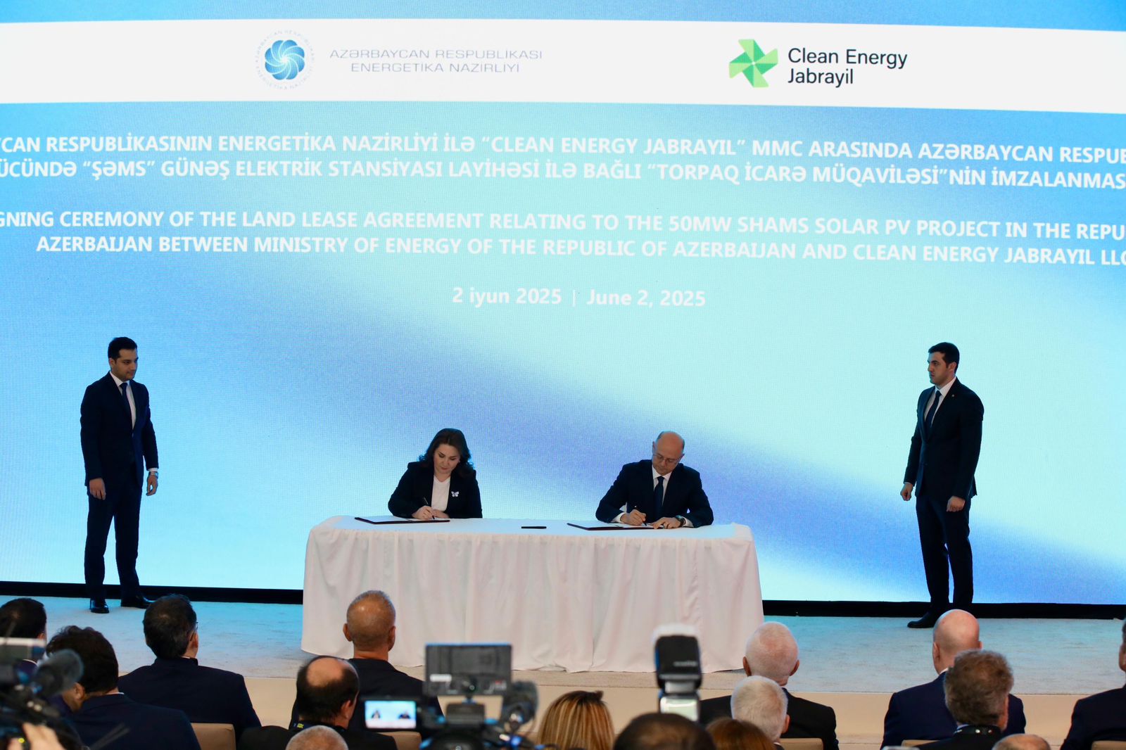 Azad edilmiş ərazilərin “yaşıl enerji zonası”na çevrilməsi məqsədilə həyata keçirilən təşəbbüslər çərçivəsində, Cəbrayıl rayonunda tikilməsi planlaşdırılan iki günəş elektrik stansiyası üzrə də müqavilələr imzalanıb. 50 MVt gücündə “Üfüq” GES və 50 MVt gücündə “Şəms” GES layihələri üzrə “Torpaq icarə müqavilə”lərini energetika naziri Pərviz Şahbazov, “Enerso Jabrayil” MMC şirkətinin direktoru Eldar Məmmədzadə və “Clean Energy Jabrayil” MMC-nin direktoru Xəyalə Nağıyeva imzalayıb. Hər iki layihəyə dair “Enerji alqı-satqı müqavilə”ləri və “Ötürücü şəbəkəyə qoşulma müqavilə”ləri bağlanıb.