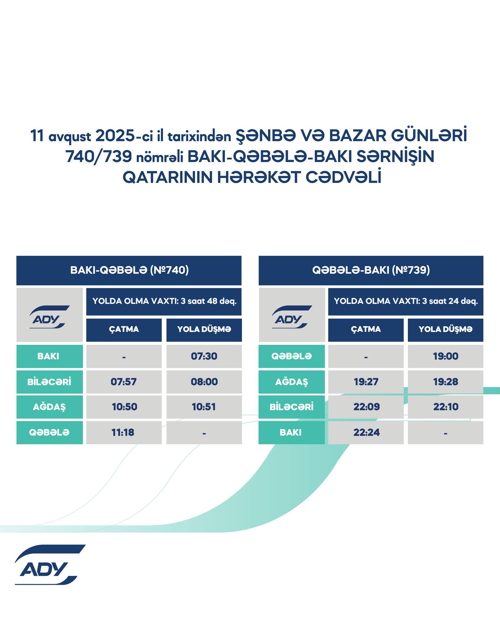 Bakı–Keşlə sahəsində aparılan təmir işləri ilə əlaqədar olaraq, bu gündən Bakı-Balakən-Bakı, Bakı-Qəbələ-Bakı və Bakı-Qazax-Bakı marşrutu üzrə sərnişin qatarları yenilənmiş hərəkət cədvəli ilə xidmət göstərəcək.