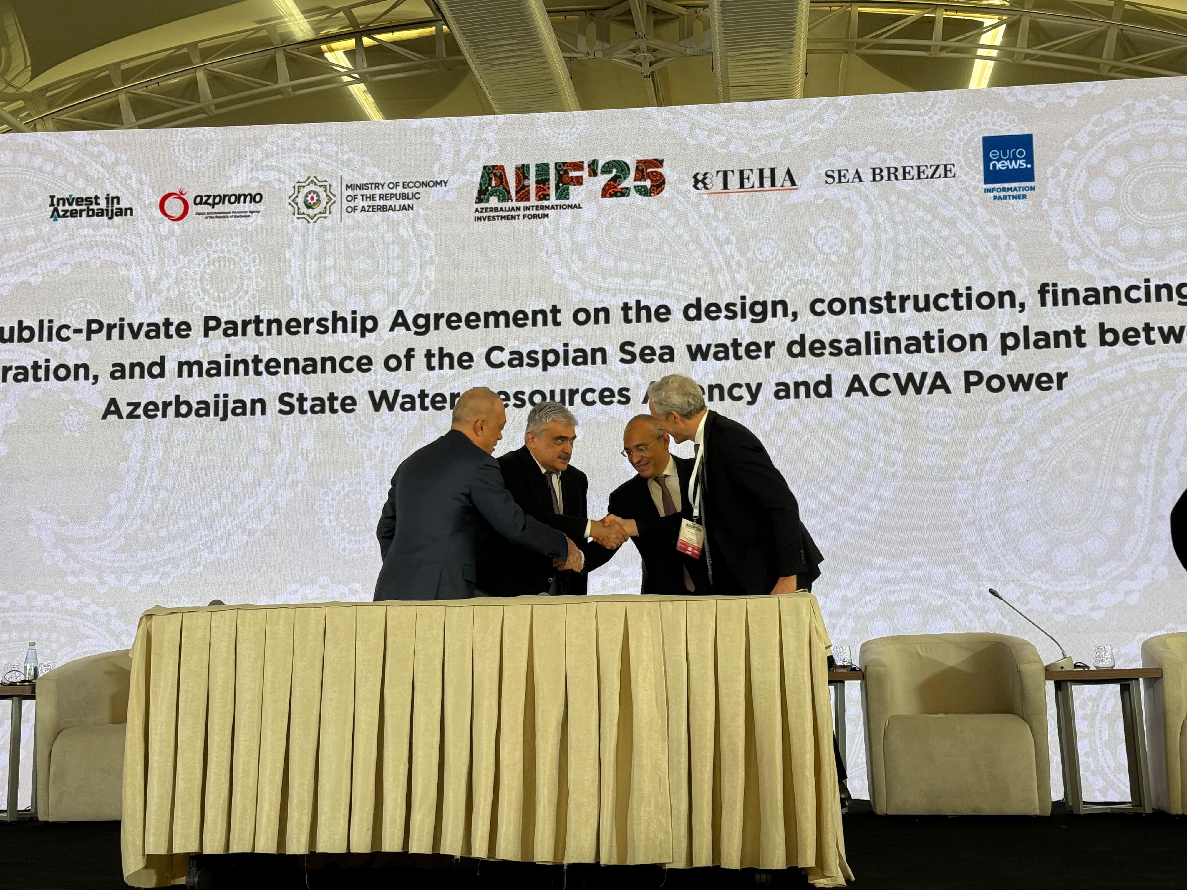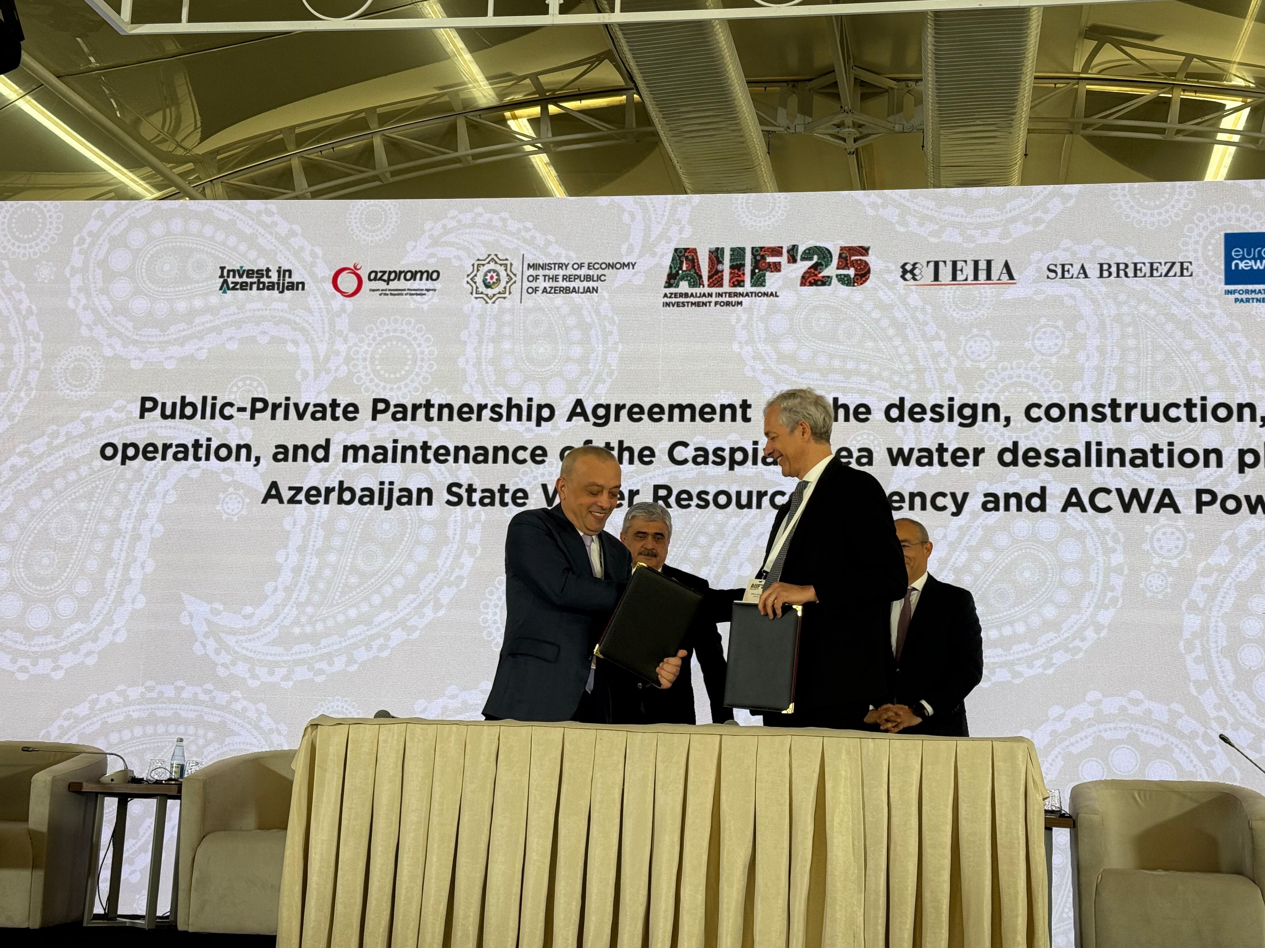 Daha sonra tərəflər arasında Xəzər dənizinin suyunun duzsuzlaşdırma zavodunun layihələndirilməsi, tikintisi, maliyyələşdirilməsi, istismarı və texniki xidməti üzrə Dövlət-özəl tərəfdaşlığı haqqında Saziş imzalanıb. Sənədi Dövlət Su Ehtiyatları Agentliyinin sədri Zaur Mikayılov və “ACWA Power” şirkətinin baş icraçı direktoru Marko Arçelli imzalayıb.