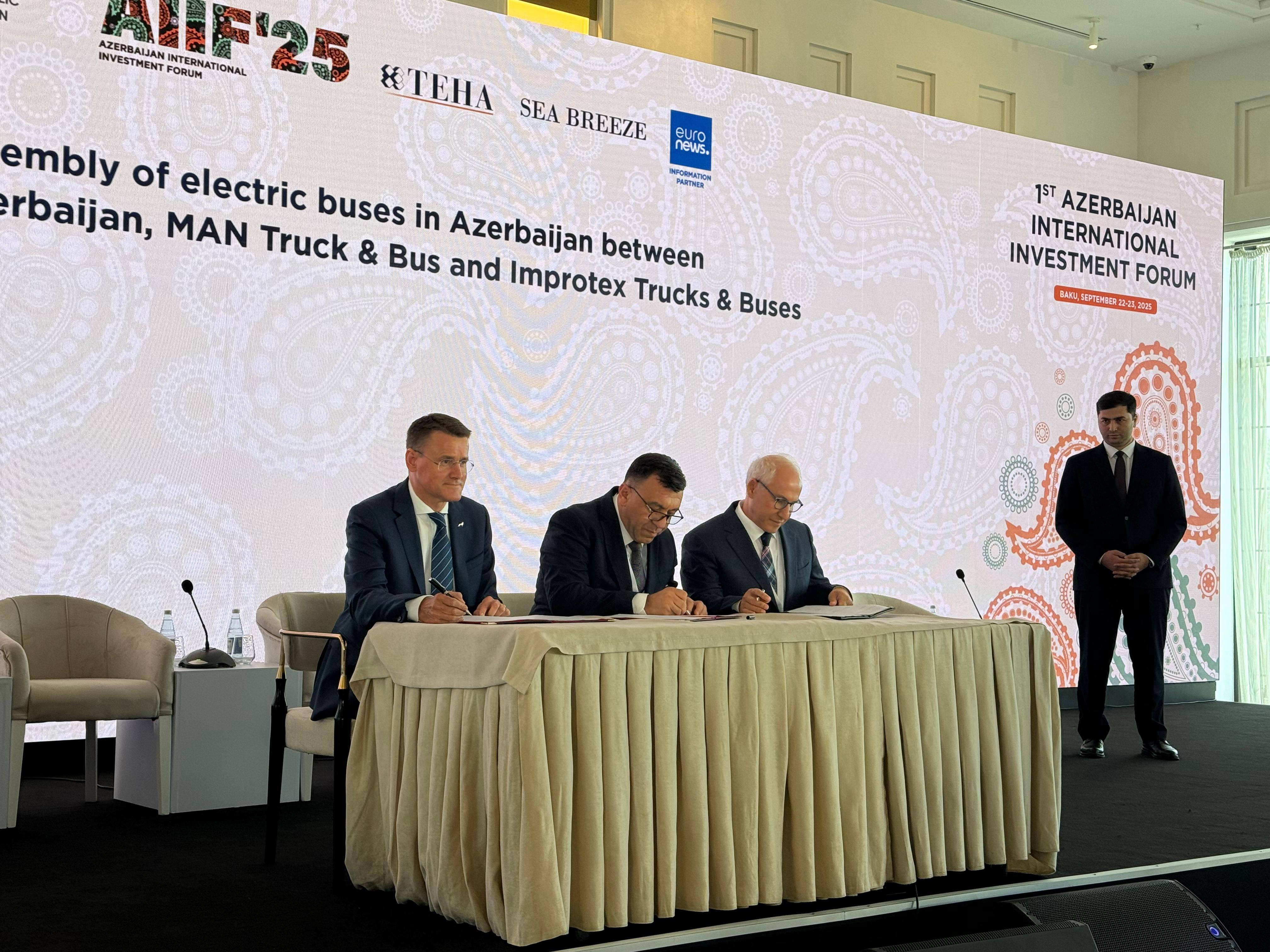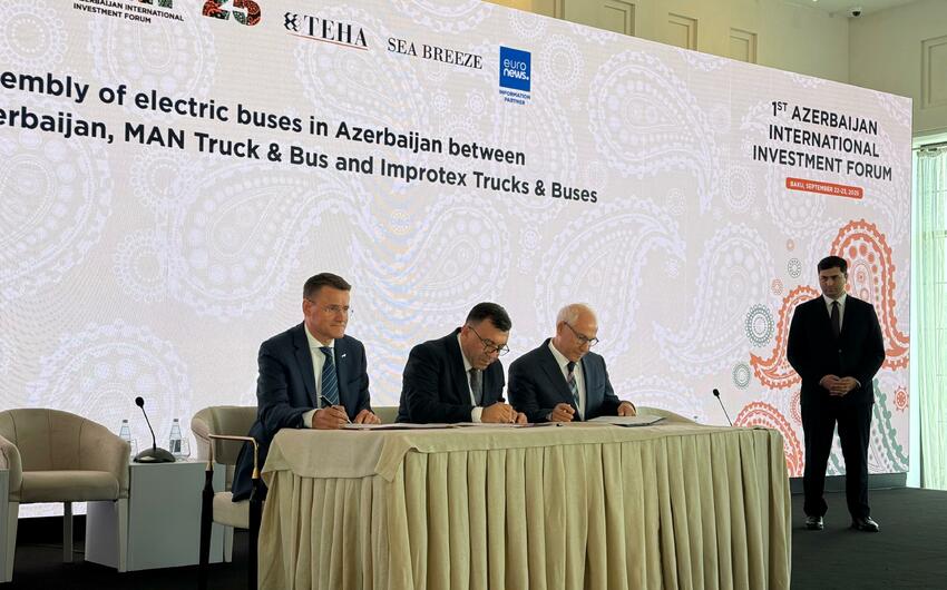 Teleqraf xəbər verir ki, Bakıda keçirilən 1-ci Azərbaycan Beynəlxalq İnvestisiya Forumu çərçivəsində Azərbaycanın iqtisadiyyat naziri Mikayıl Cabbarov "Improtex Group" və "MAN Truck & Bus" şirkəti rəhbərliyi ilə elektrik avtobusların yığılması üzrə sazişi imzalayıb.