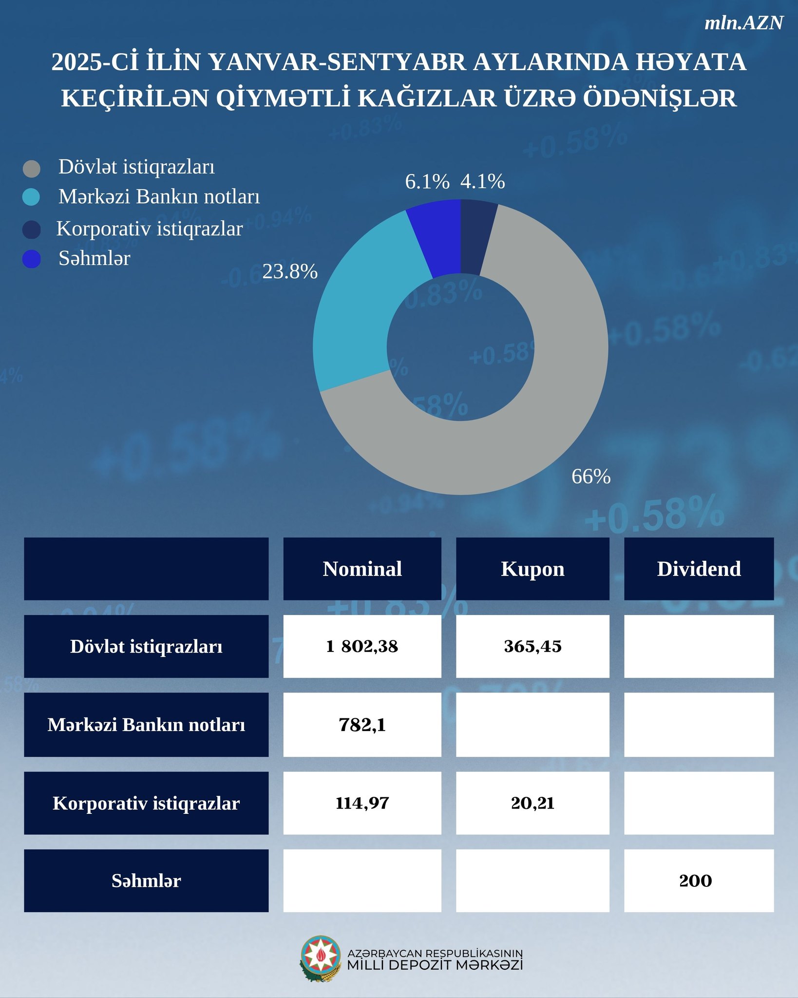 2025-ci ilin ilk doqquz ayında qiymətli kağızlar bazarında aparılan ödənişlərin əsas hissəsini dövlət istiqrazları və Mərkəzi Bankın notları təşkil edib.