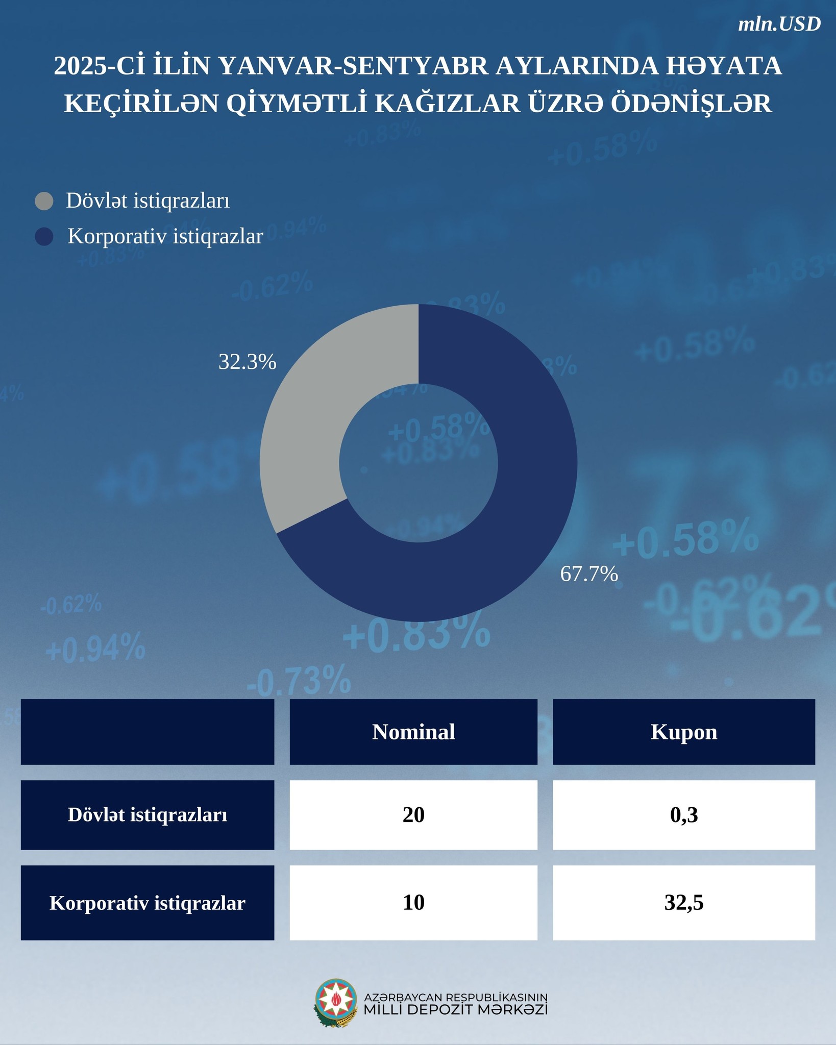 Dollar ifadəsində isə həyata keçirilən qiymətli kağızlar üzrə ümumi ödənişlərin 67,7%-i dövlət istiqrazlarının, 32,3%-i isə korporativ istiqrazların payına düşüb.