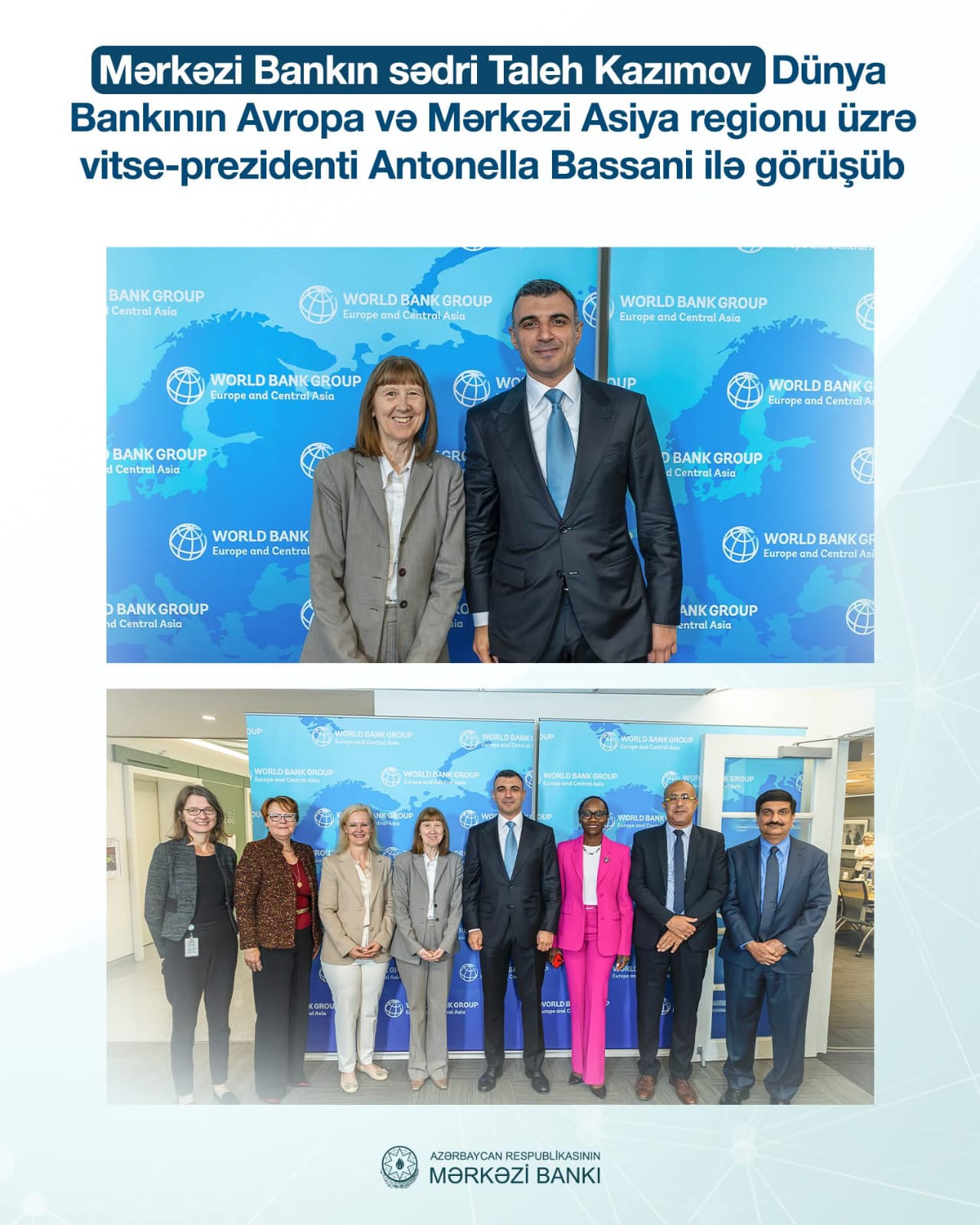 Teleqraf xəbər verir ki, Mərkəzi Bankın sədri Taleh Kazımov ABŞ-nin Vaşinqton şəhərinə işgüzar səfəri çərçivəsində Dünya Bankının Avropa və Mərkəzi Asiya regionu üzrə vitse-prezidenti Antonella Bassani ilə görüşüb.