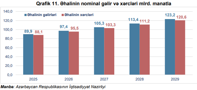 2029-cu ildə isə əhalinin gəlirləri 123,2 milyard manata, xərcləri isə 120,6 milyard manata çatacaq.